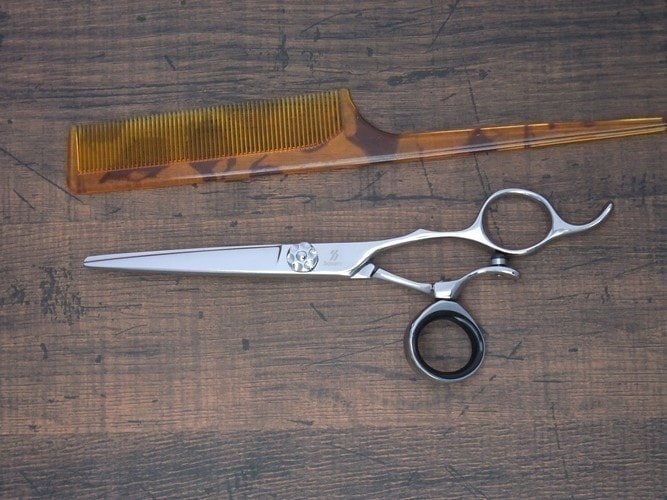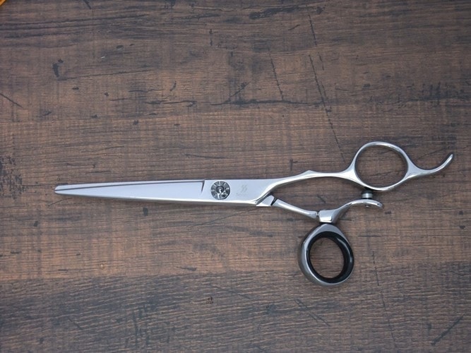 親指が回転するハンドルでカットの負担を軽減するスタンダードなシザーです。小指掛けカット、曲げが可能です。