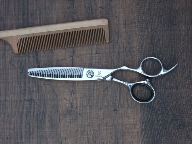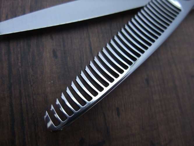 特殊な櫛刃の幅間隔が広く抜けが良い設計で毛髪を横に逃がしながらカットが可能。小指掛けカット、曲げが可能です。