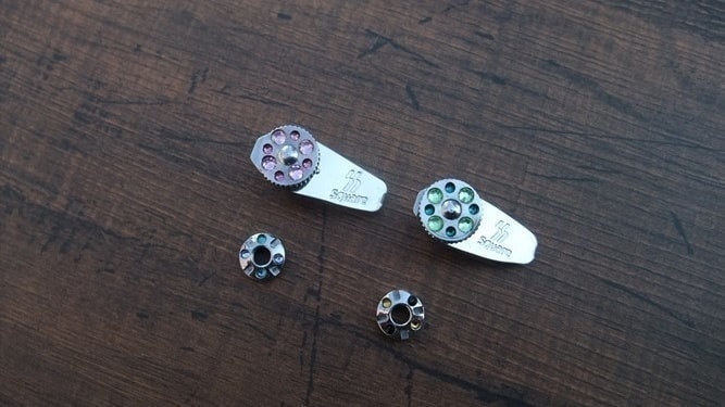 ネジのナットにラインストーン(26色)を埋め込む加工です。