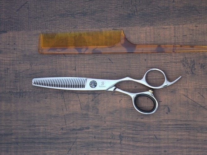 10層からなるダマスカス模様が美しいシザーです。特殊な櫛刃形状で髪の毛を傷めにくくなっています。毛髪を横に逃がしながらカットが可能。