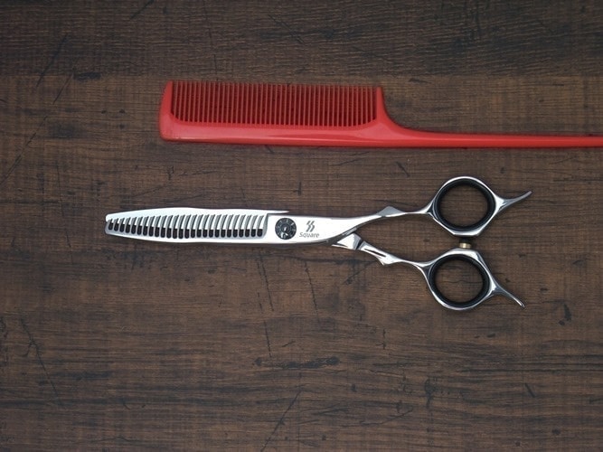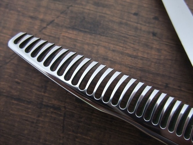 特殊な櫛刃形状により毛髪を横に逃がしながらカットが可能。