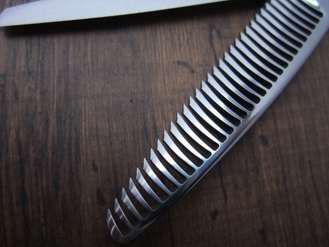 特殊な櫛刃(スリット目)でカットラインがでにくく使いやすいシザーです。小指掛けカット、曲げが可能です。